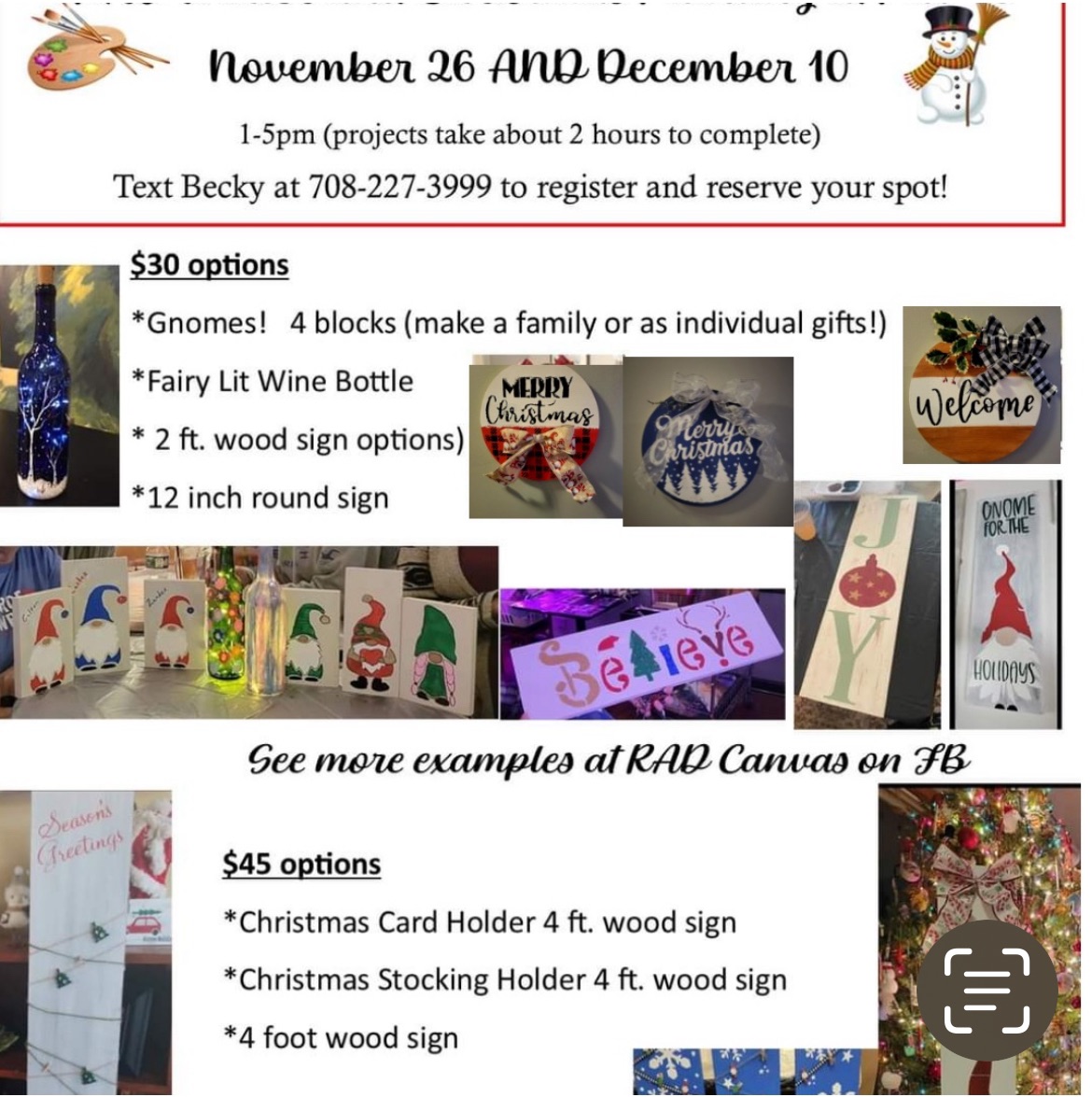 Paint with RAD Canvas this Sunday at 1pm! Make your own holiday decorations or create presents for your loved ones! Text “PUB 78” to 708-227-3999 to sign up! |